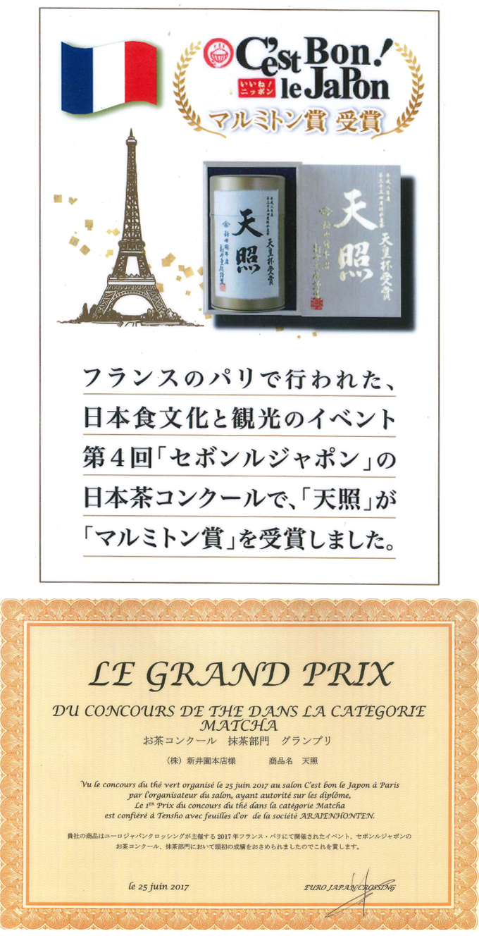 フランスのパリで行われた、日本食文化と観光のイベント、第4回「セボン ル ジャポン」の日本茶コンクールで、『天照』が「マルミトン賞」を受賞しました。
